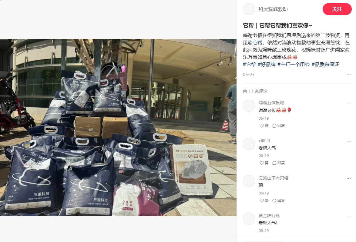 Each year, we donate cat litter and cat food to more than a hundred university rescue groups across China — supporting young people who dedicate their time to giving strays a cleaner, safer place to rest.